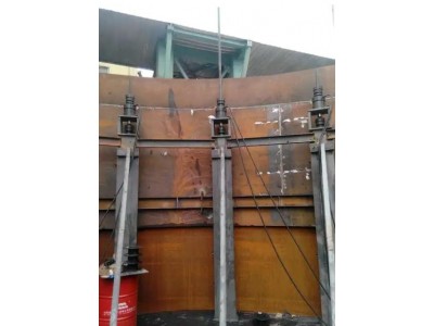 钢内筒的高度一般都高出烟囱混凝土外筒,故钢内筒的提升施工换一次吊点在鹤壁电厂三期工程钢内筒施工中,烟囱外筒壁高235m;钢内筒高240m;烟囱内壁每隔30~40m布置一个钢结构检修工作平台,吊装平台设置在烟筒220m标高处,液压顶升装置其施工方案如下:①在烟囱内Om处组装焊接平台,先加工焊接钢内筒顶部不锈钢烟道口,完成后,加工焊接第1吊装段,连接下锚头并穿钢索后提升至超过下一基本节高度时停止提升,在吊装段下方焊接基本节,对中、找正、放下上段筒体,对口、焊接后再次提升,周而复始②钢内筒施工至其长度为50m时,焊接第2吊装段,然后继续提升组装钢内筒③钢内筒施工至其高度为80m时,将下锚头从第1吊装段移至第2吊装段为了避免第1吊点与吊装平台干涉,换完吊点后,割去第1吊点此时吊点上方筒体长50m;下方筒体长30m;继续提升④提升组装钢内筒至全长240界拆除设备,施工结束。