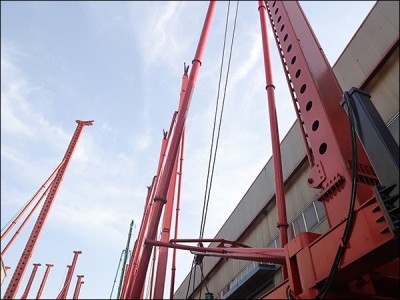 动力头式双轴搅拌桩机将立柱各节在底盘前部与立柱底座接好,注意在滑道上加润滑脂。