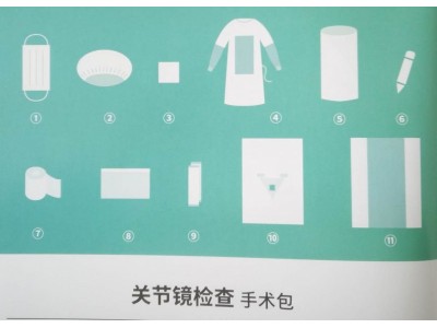 手术包配置:一次性使用医用口罩1个、一次性使用帽1个、擦手巾(40*40cm)4块、一次性使用手术衣(加强型)2件、集液袋1个、弹性绷带1卷、脚套1双、医用记号笔1支、备胶料(10*50cm)2条、关节镜检查单1条、一次性使用包布1条。