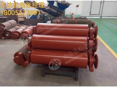 驱动滚筒是传递动力的主要部件。为了传递需要的牵引力,输送带与滚筒间要具有足够的摩擦力。根据摩擦传动的理论,在设计或选择驱动装置时,可采用增加输送带与驱动滚筒间的摩擦和围包角的方法来保证获取需要的牵引力。采用单滚筒驱动时,围包角可达180°-240°;当采用双滚筒驱动时,围包角为360°-480°左右。用双滚筒传动能大大提高输送机的牵引力,所以常常被采用,尤其当运输长度比较长时,一般采用双滚筒驱动。驱动滚筒外表面一般是尼龙材料做的胶面,并有人字形或X的沟槽以增加滚筒的摩擦力。