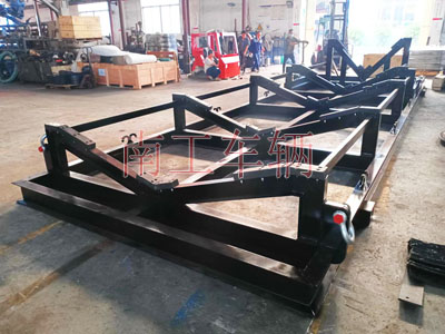 1、船舶起吊底架设计为骨架式,主梁为20号焊接式型工字钢材(Q235),副梁为14号工字钢材,承载能力为12吨,底架外形尺寸长度为10米,宽度为2.96米,高度约0.7-1.3米。