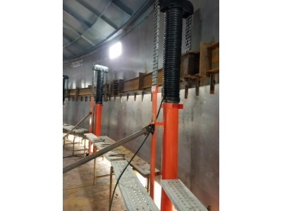 (1)液压提升机械。通过PLC控制液压同步顶升系统实现顶升。PLC控制液压同步系统由液压系统(千斤顶、油管、油泵、油缸等)、传感器等信号传输系统、计算机控制系统三部分组成。液压系统由计算机控制,可以全自动完成同步移位,实现力和位移控制、操作闭锁、过程呈现、故障警报等多种功能。每一个千斤顶都带有可以自动和手动锁死的阀,每一个油泵既可以单独操作,也可以由电脑主控系统统一操作,既,又灵活。