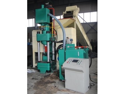 钢屑压块机的结构特征:由上下横梁、液压缸总成、加料缸、模具、料斗、充液总成等组成,上下横梁由立柱和螺母联接,主液压缸前端用法兰联接在横梁底部,模具固定在下横梁上,模套固定在模具内,冲头直接联接在油缸活塞杆顶端,模套和冲头均可拆卸和更换。有一抽板缸位于主机下模具后面,抽板缸前位时与模套形成模腔底部,后位时底部形成空间,利于饼块落下,同时具有推饼出模具底部的功能,加料缸和加料斗祖晨自动加料机构,机器的加料由加料缸的往复动作完成。充液系统位于横梁侧面,以补充主油缸快速前进所需的油液。