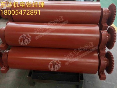 驱动滚筒是传递动力的主要部件。为了传递需要的牵引力,输送带与滚筒间要具有足够的摩擦力。根据摩擦传动的理论,在设计或选择驱动装置时,可采用增加输送带与驱动滚筒间的摩擦和围包角的方法来保证获取需要的牵引力。采用单滚筒驱动时,围包角可达180°-240°;当采用双滚筒驱动时,围包角为360°-480°左右。用双滚筒传动能大大提高输送机的牵引力,所以常常被采用,尤其当运输长度比较长时,一般采用双滚筒驱动。驱动滚筒外表面一般是尼龙材料做的胶面,并有人字形或X的沟槽以增加滚筒的摩擦力。