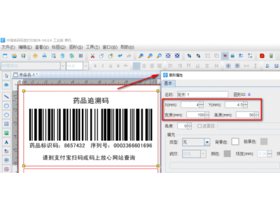 4. 在第一个药品追溯码外面添加一个矩形框作为定位使用 点击软件左侧的“绘制圆角矩形”按钮,在白色画布上绘制一个矩形框,设置矩形框的宽度(100mm)和高度(56mm),X(距离软件左侧的距离)为4mm,Y(距离软件顶部的距离)为4.5mm,然后点击软件顶部的“不可见”按钮,将矩形框设置成不可见状态。