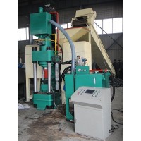钢屑压块机的结构特征:由上下横梁、液压缸总成、加料缸、模具、料斗、充液总成等组成。上下横梁由立柱和螺母联接,主液压缸前端用法兰联接在横梁底部,模具固定在下横梁上,模套固定在模具内,冲头直接联接在油缸活塞杆顶端,模套和冲头均可拆卸和更换,有一抽板缸位于主机下模具后面,抽板缸前位时与模套形成模腔底部,后位时底部形成空间,利于饼块落下,同时具有推饼出模具底部的功能。加料缸和加料斗组成自动加料机构,机器的加料由加料缸的往复动作完成。充液系统位于横梁侧面,以补充主油缸快速前进所需的油液。